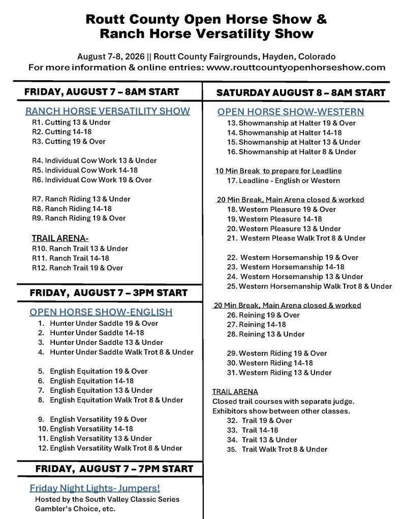 NEW! This year the Routt County Open Horse Show will also be managing the 2026 Routt County Fair Ranch Horse Versatility Show, on August 7, 2026. More info coming.